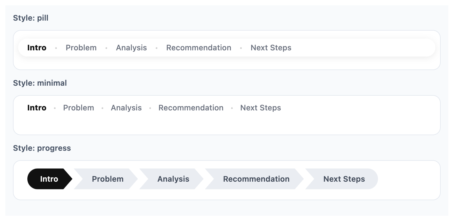 minimal: a lighter text-first version with less visual weight.progress: a more structured roadmap bar that makes done/current/upcoming very explicit.